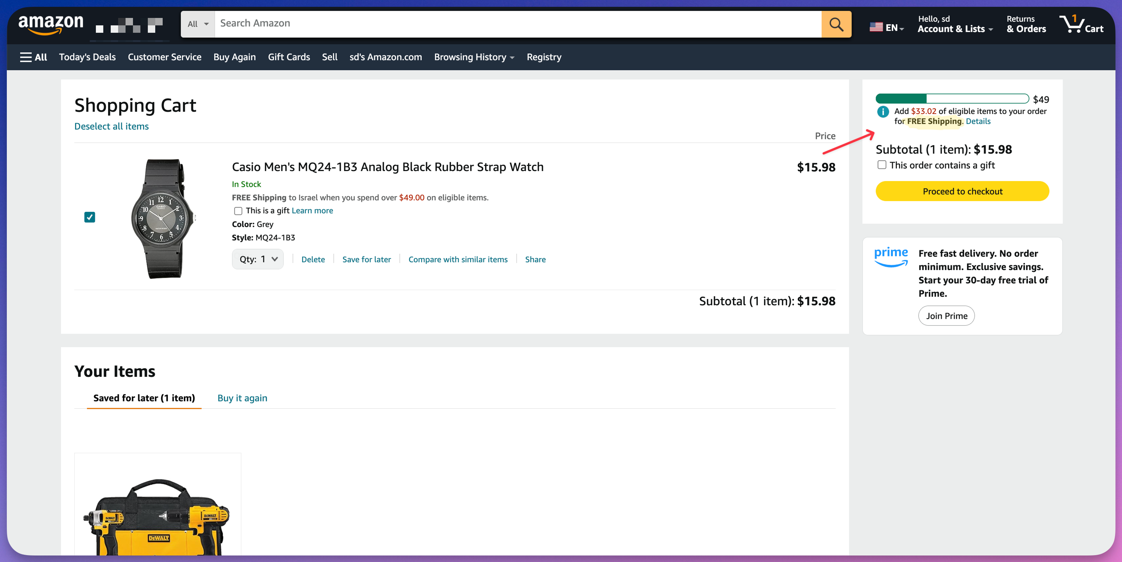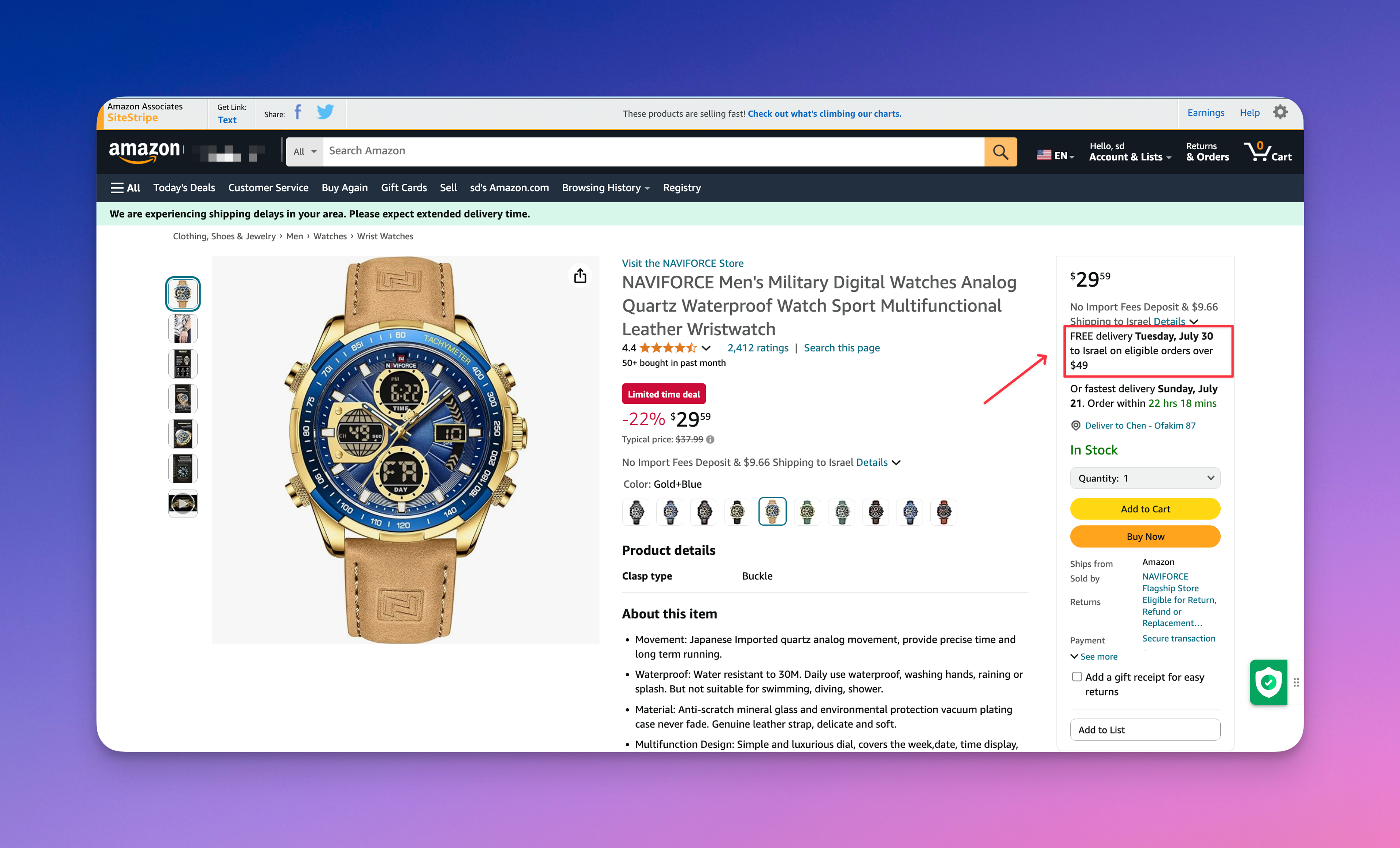 1. קנייה ב-$49 ומעלה: כדי ליהנות ממשלוח חינם, עליכם לרכוש מוצרים בשווי כולל של $49 ומעלה. ניתן לשלב כמה מוצרים יחד כדי להגיע לסכום הנדרש.