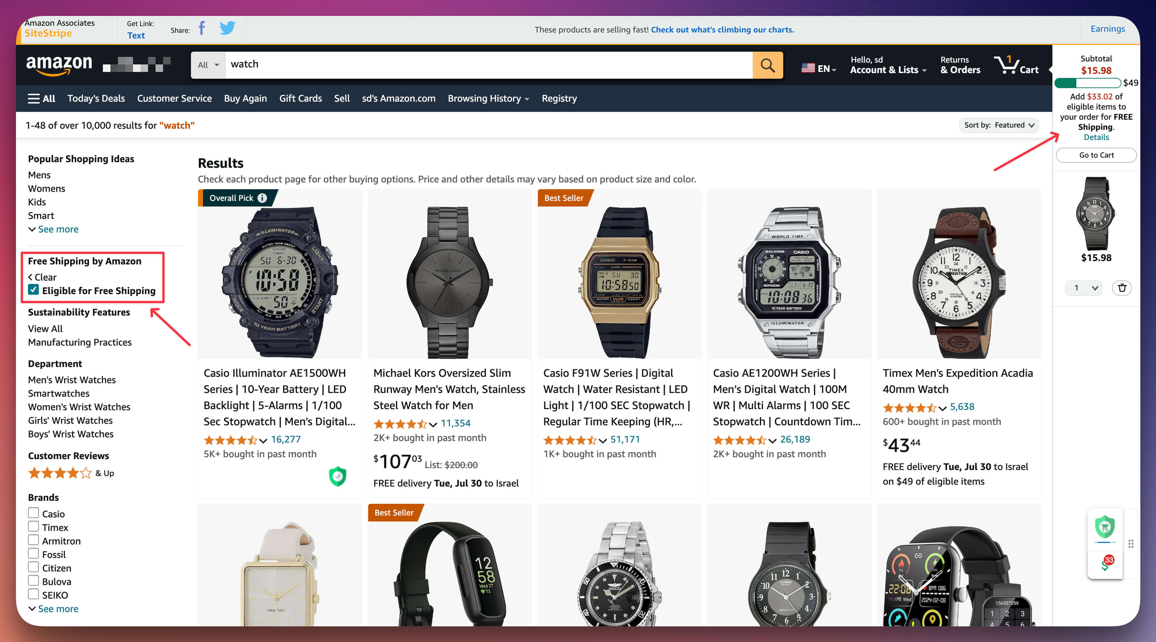2. סינון מוצרים עם משלוח חינם: אמזון מאפשרת לסנן תוצאות חיפוש כך שיוצגו רק מוצרים הזכאים למשלוח חינם. אפשרות זו חוסכת זמן ומבטיחה שתראו רק את המוצרים המתאימים. - לינק לדוגמא